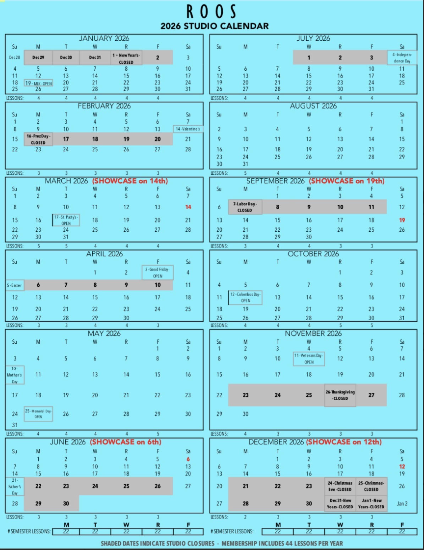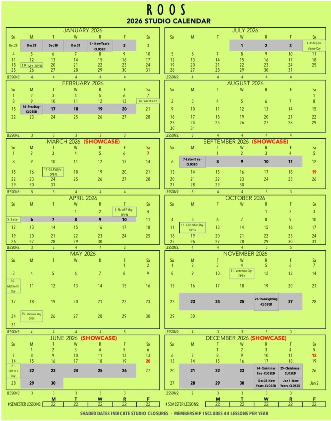 Our student scheduling software conveniently shows the dates of all upcoming lessons! If we are closed, there will be no lesson scheduled for that day. You can cancel a lesson 24 hours in advance from the Student Portal and a makeup lessons will be posted to your account. You can reschedule makeup lesson through the portal on your own at a later time 👍