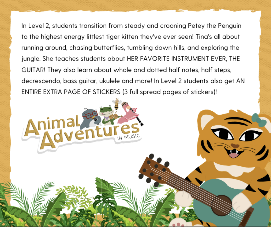 This program covers 10 instruments throughout a series of 10 levels. Throughout this exciting program, your child will travel through 10 themed books with their teacher, exploring a different instrument in each. Every book is filled to the brim with learning activities, games, stickers and more and easily divides the program into 10 extremely structured levels, each of which builds off the previous. As your child completes each level, they will receive a special themed medal featuring the color and animal character from that level.