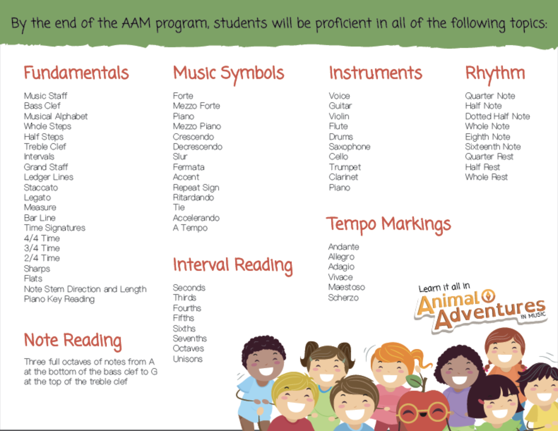 Adventures in Music teaches a robust, comprehensive curriculum, covering topics