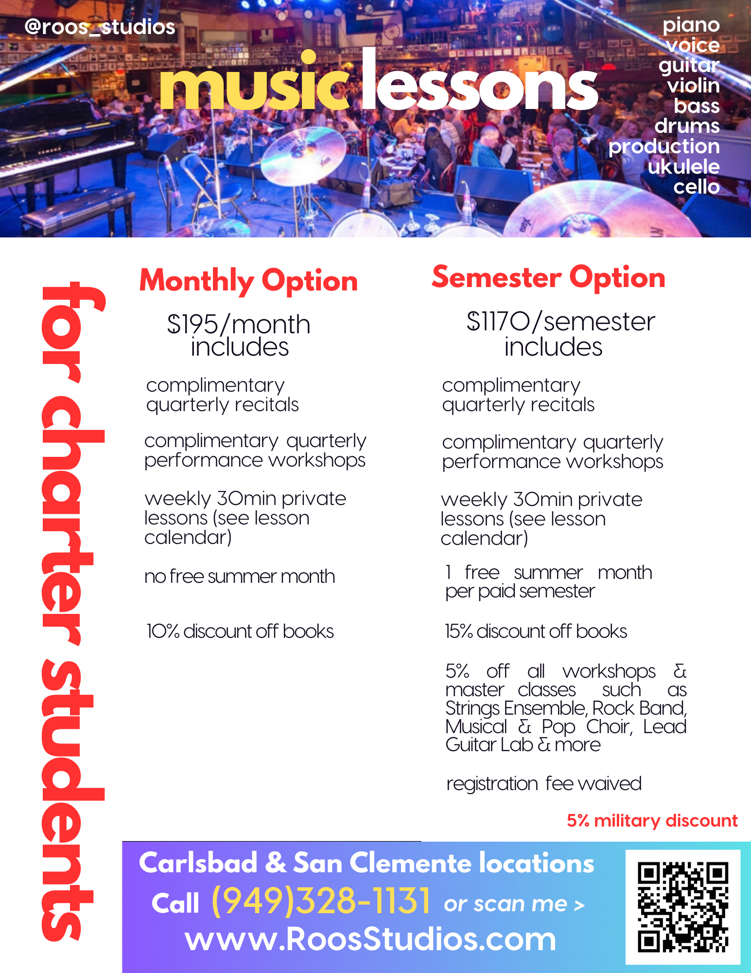 WEEKLY 30-MINUTE PRIVATE (see lesson calendar) - Enrolling in a school comes with the fantastic advantage of ensuring lesson continuity and coverage, even when your primary teacher is unavailable due to illness or vacation. We operate as a school and you are enrolled in a regular private class day and time where a main teacher will be assigned. If a main teacher is out, another teacher on staff will sub the class. This guarantees that your child receives uninterrupted and consistent lessons.